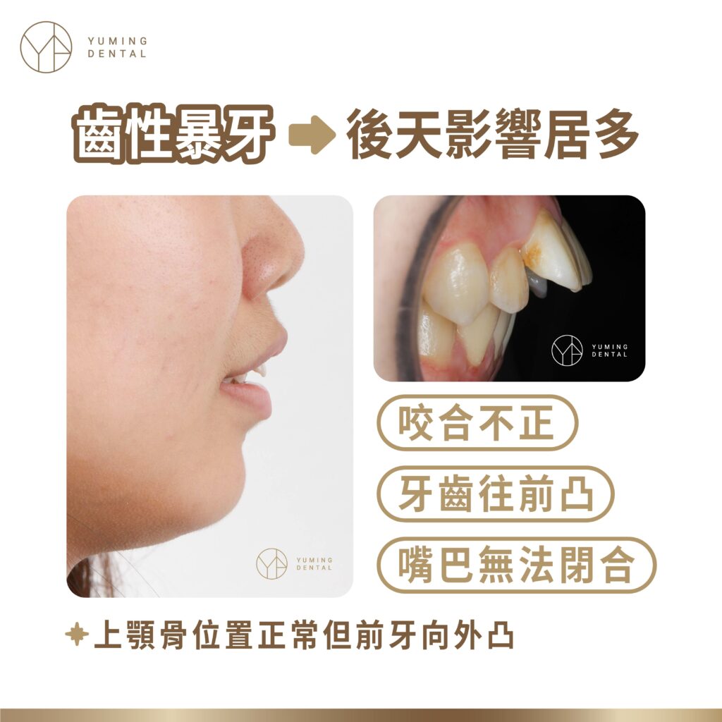 齒性暴牙的特徵是門牙的暴牙明顯前傾或外凸,但上顎骨的位置大致正常。這類型的暴牙通常是後天習慣所造成。